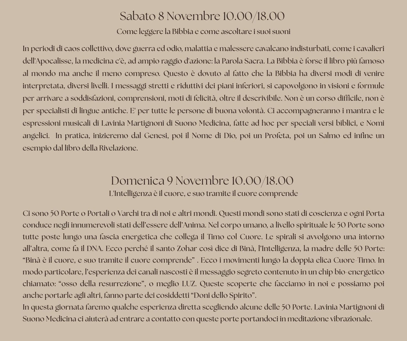 La seconda giornata sarà la storia delle due Fiamme Gemelle, come raccontata dal Cantico dei Cantici. Lì scopriremo delle istruzioni operative nuove rispetto al passato. Sono contenute nei codici cabalistici di quei versi, che altrimenti sembrano solo poetici e romantici. Ci dicono invece come trovare la propria fiamma Gemella e come diventare operatori di pace cosmica.